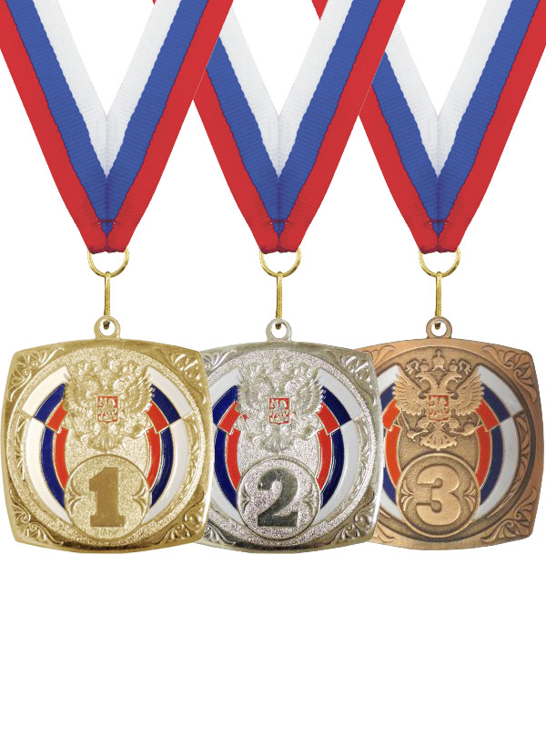 Комплект медалей. В состав комплекта входят: три медали (Золото, Серебро, Бронза) и три российские ленты. Ленту можно заменить на любою аналогичной цены.